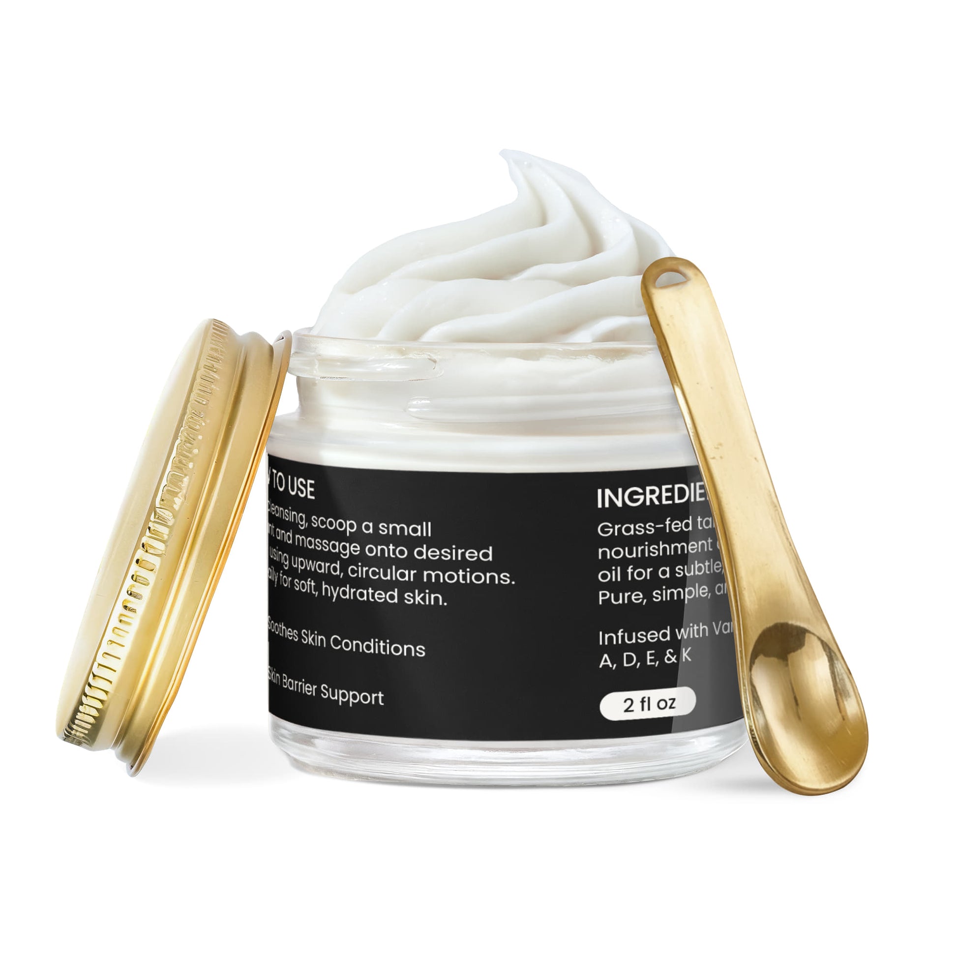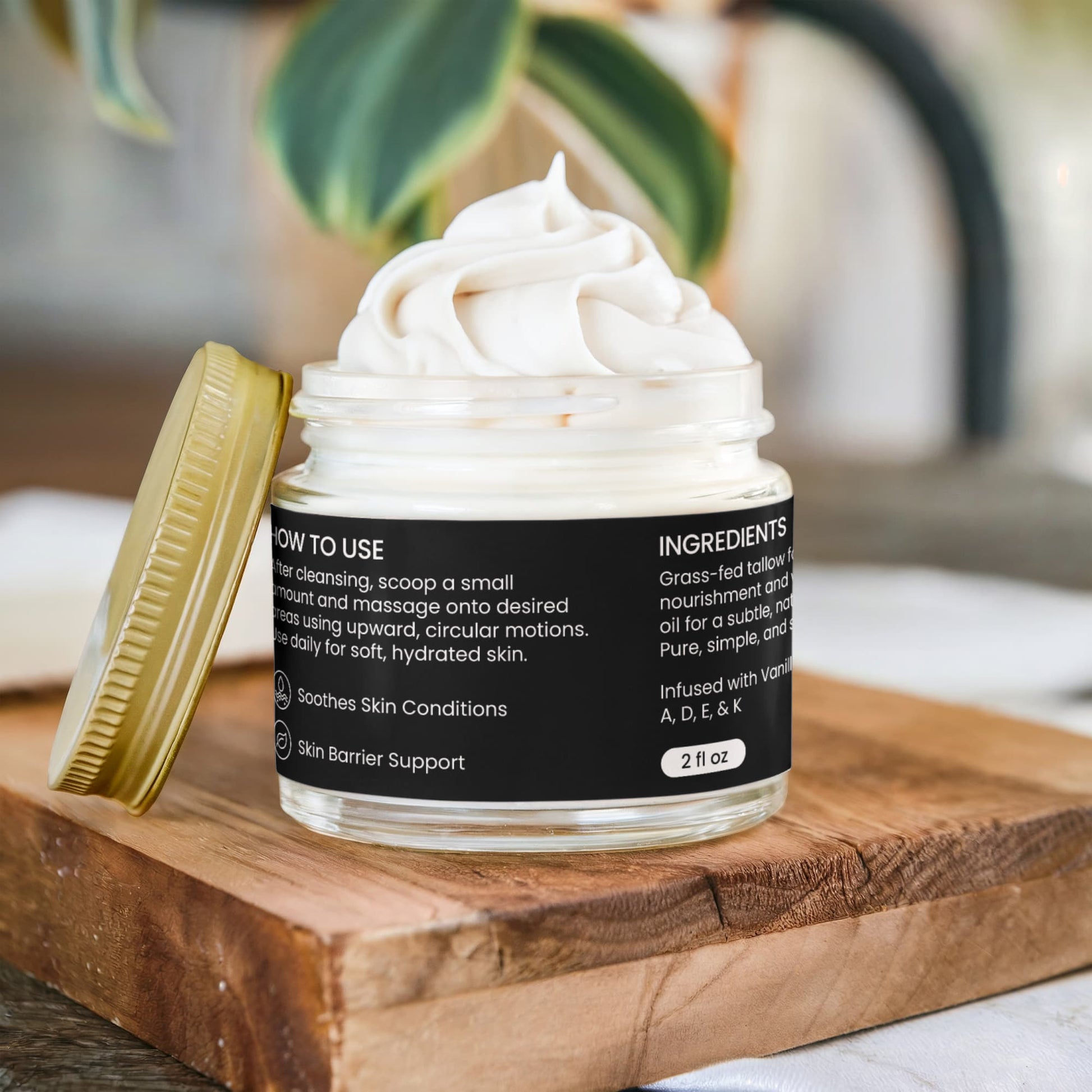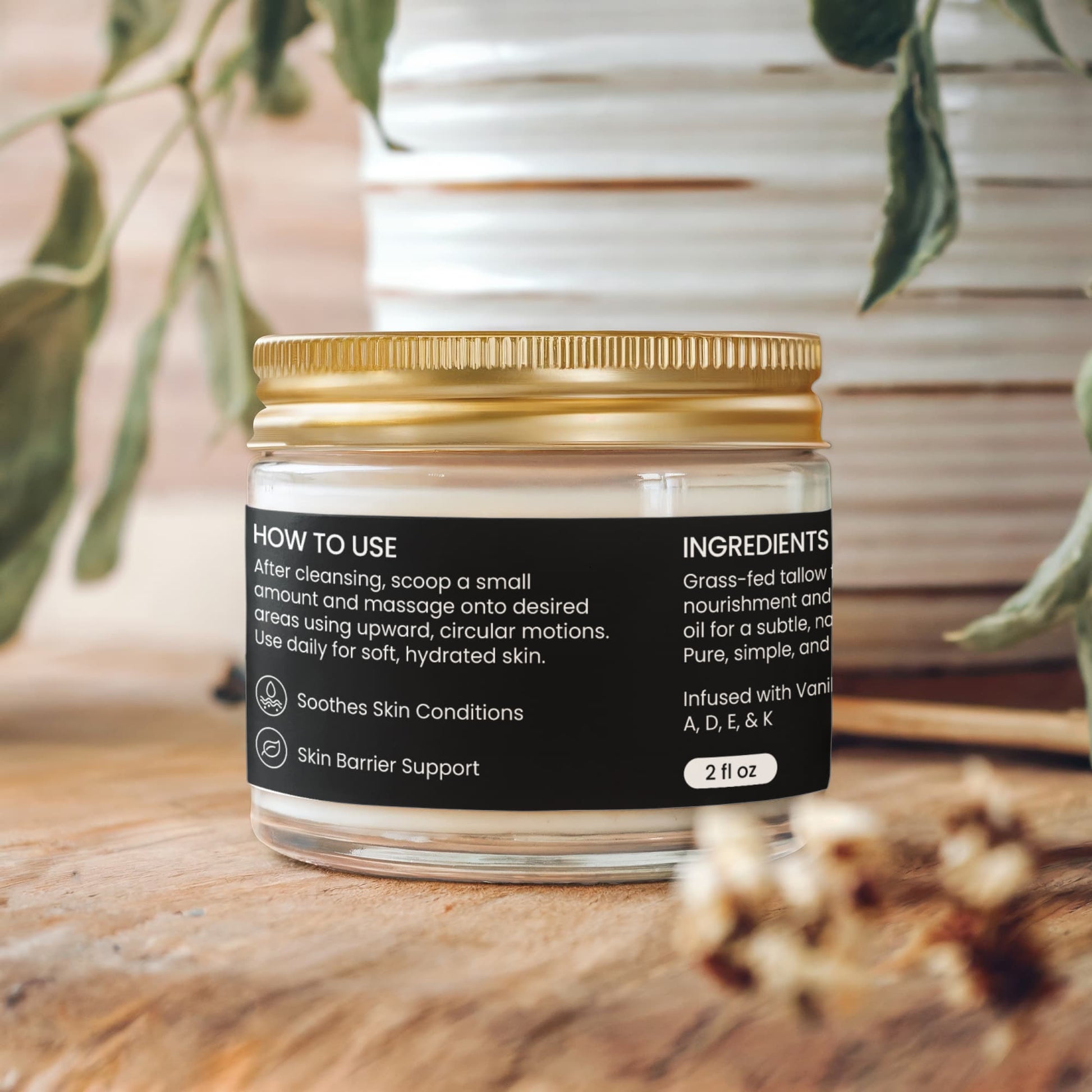 Grass-fed tallow for deep nourishment and vanilla essential oil for a subtle, natural warmth. Pure, simple, and skin-loving.